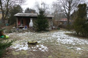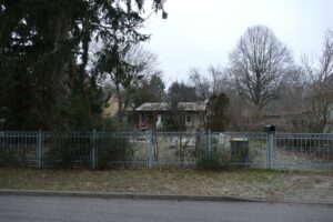 Baugrundstück in einer Seitenstraße von Bernau, bebaut mit einem Kleinsthaus im Bungalowstil.
